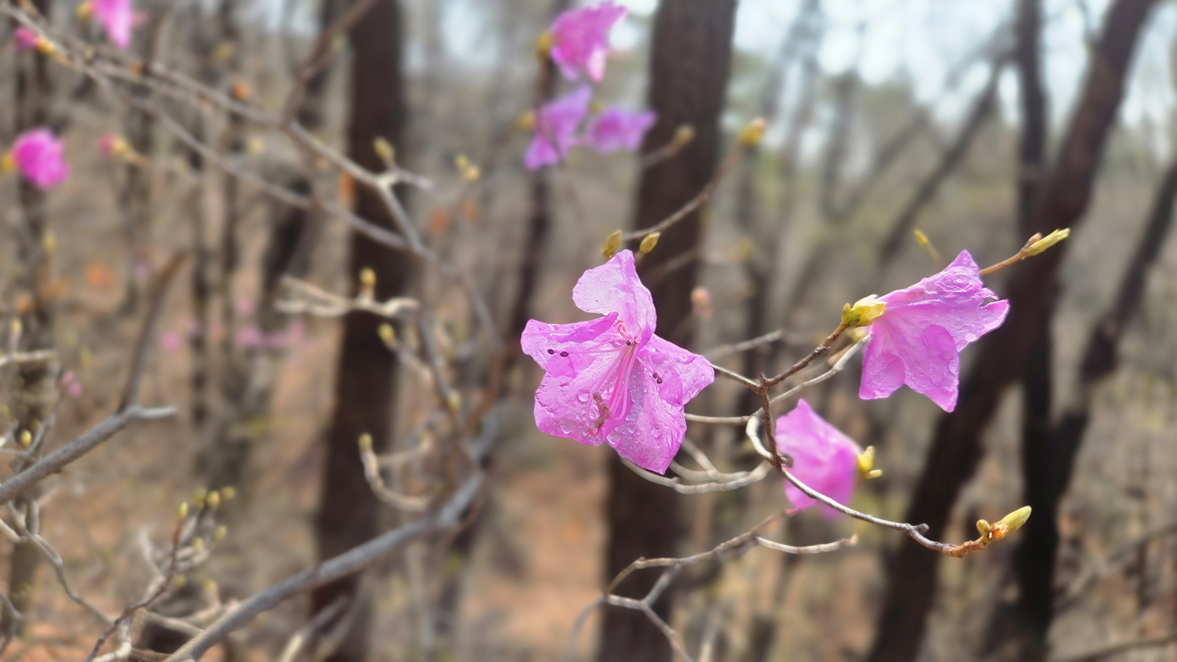 어제 제법 내린 비로 진달래 꽃송이는 고개를 숙였다.